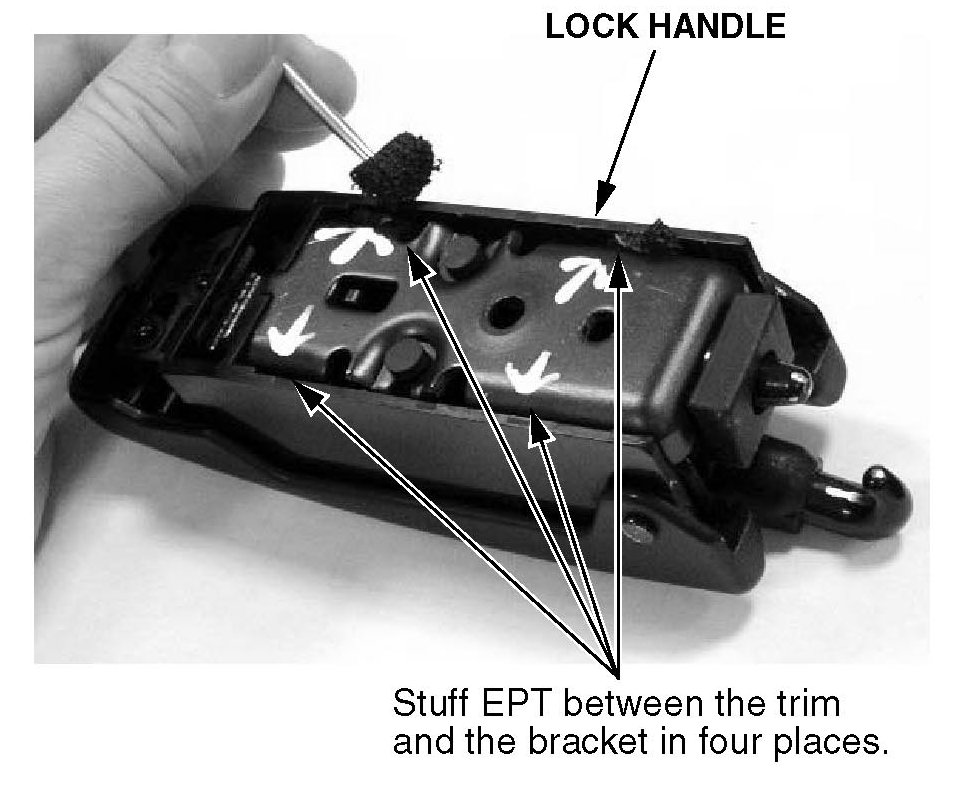 4. Use a small pocket screwdriver to stuff four wads of EPI sealer between the plastic trim and the mounting bracket of the lock handle as shown.