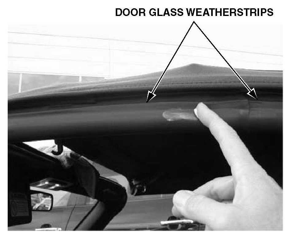 10. Open the convertible top halfway, and apply a dab of silicone grease to the hard plastic caps on the ends of the convertible top frame and to the ends of the door glass weatherstrips.