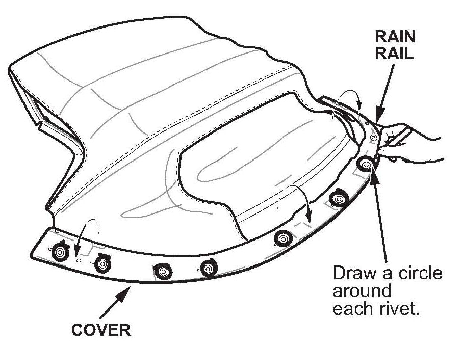 2. With the convertible top assembly out of the vehicle, use a white marker to draw a circle around each of the 11 rivets.