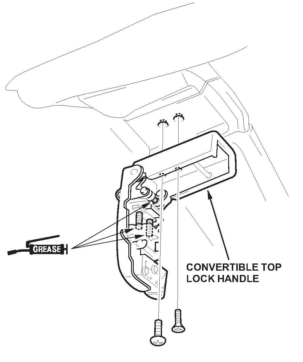 Replace the convertible top cloth and one or both lock handles, and remove any rough spots on the right rear frame hinge.