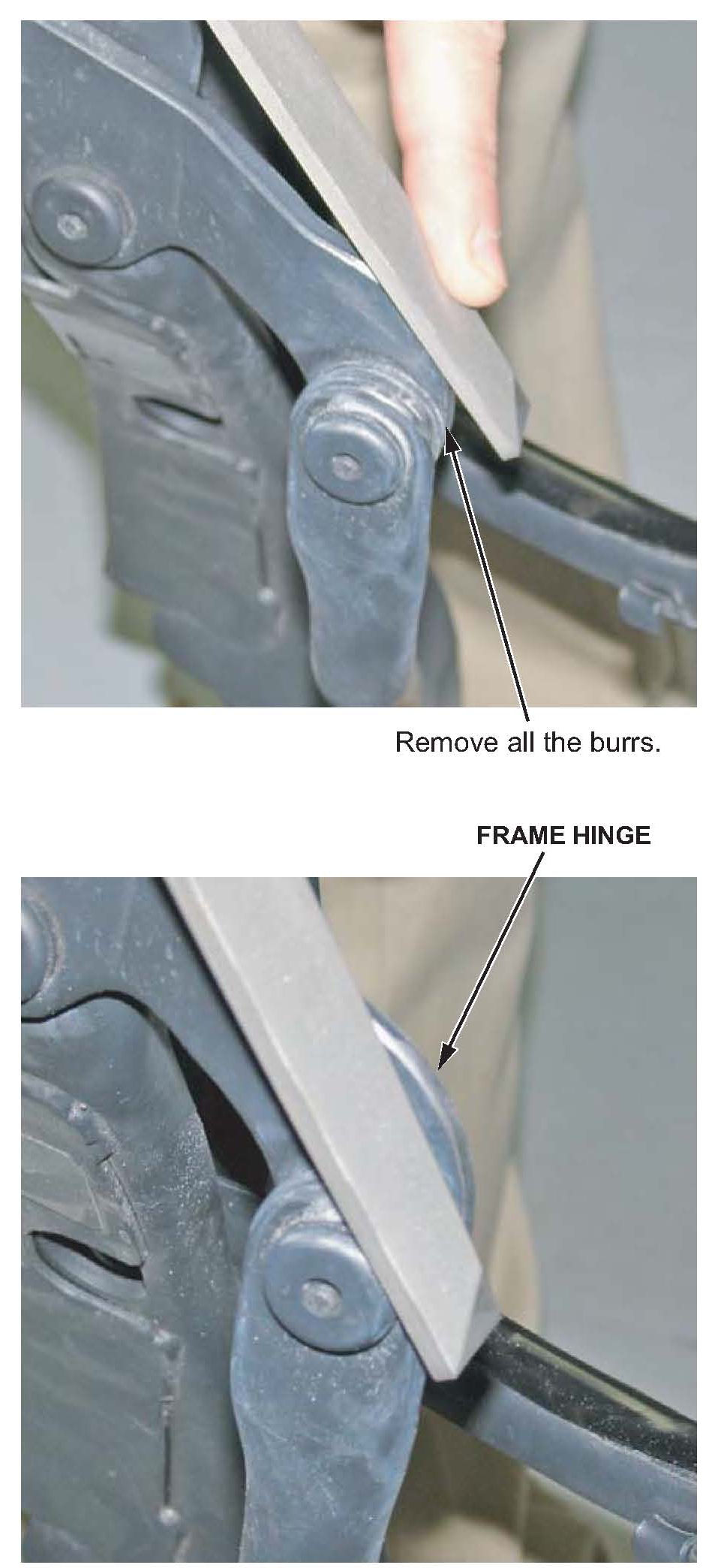 15. Locate the burrs at the right-rear of the frame hinge, then use a file to remove the burrs and any rough areas.