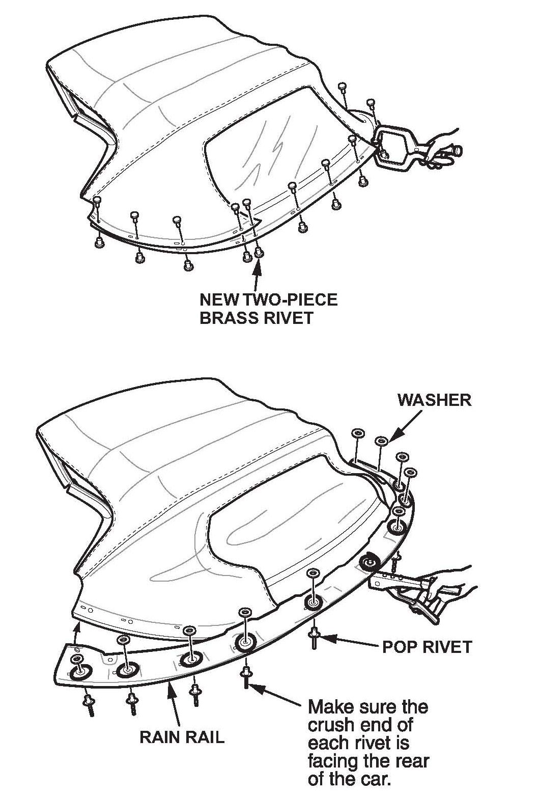 18. Reinstall the rain rail with 11 new brass rivets or with 11 commercially available pop rivets and washers. If using pop rivets, make sure the crush end of each rivet is facing the rear of the vehicle when the rain rail is in place.