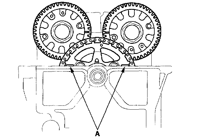 2. Set the No. 1 piston at top dead center (TDC). The TDC marks (A) on the cam chain sprocket should align with the cylinder head surface.