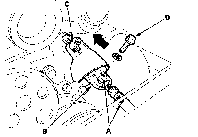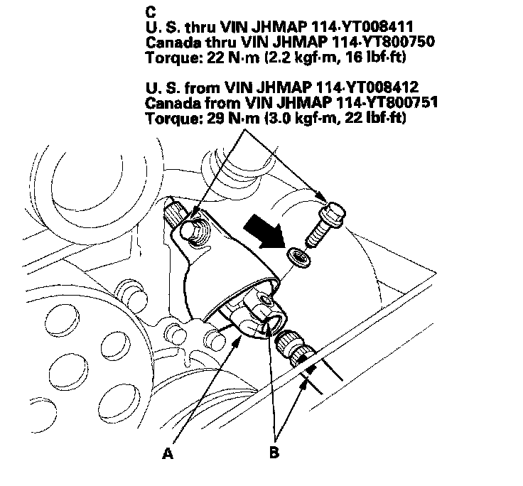 Engine Mount Replacement1. Turn the steering wheel to the straight-ahead position, then remove the key from the ignition switch to lock the steering column. Make a reference mark (A) across the steering joint (B).