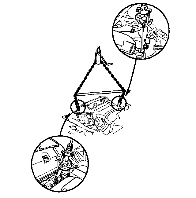 6. Attach the chain hoist to the engine as shown. Take care not to damage the rocker arm oil control solenoid (VTEC solenoid valve) and wire harness.