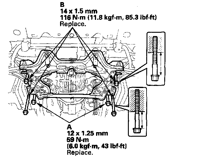 10. Loosen the four front subframe mounting bolts (B) 75 mm (3.0 inch) as shown, and lower the front subframe.