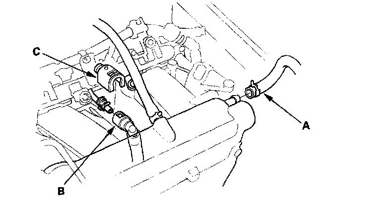 7. 2006 model: Connect the brake booster vacuum hose (A) and fuel feed hose (B), then install the quick-connect fitting cover (C).
