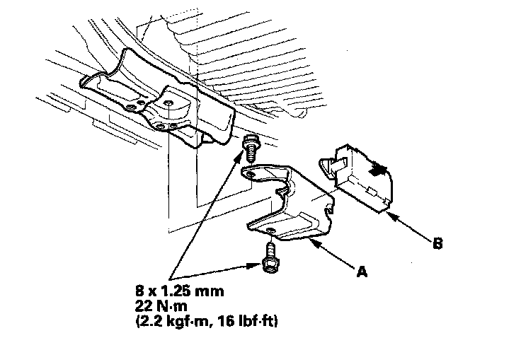 12. Install the engine stop bracket (A), then install the engine stop bracket cushion (B).