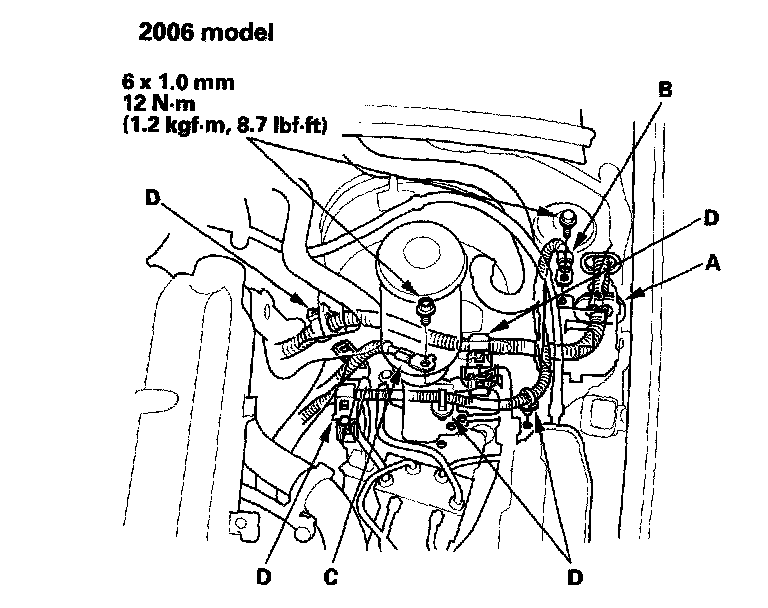 6. 2000-2005 models: Install the brake booster vacuum hose (A), fuel return hose (B) and fuel feed hose (C), using new washers (D).