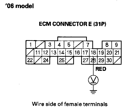 13. Using a backprobe set, measure the voltage between the No. 17 terminal of ECM connector A (32P) and body ground with the ECM connectors connected ('00-05 models) or between the No. 18 terminal of ECM connector E (31P) and body ground with the ECM connectors connected ('06 model).