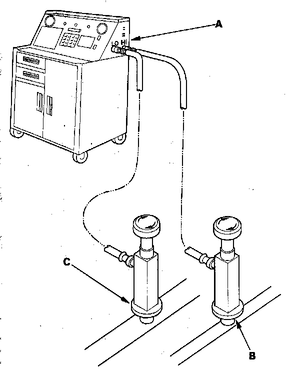 1. Connect an R-134a refrigerant recovery/recycling/charging station (A) to the high-pressure service port (B) and the low-pressure service port (C), as shown, following the equipment manufacturer's instructions.