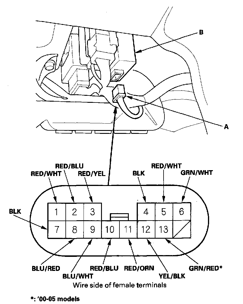 1. Disconnect the 14P connector (A) from the daytime running lights control unit (B).