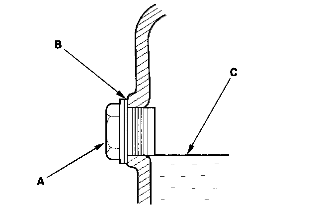 2. Remove the oil filler plug (A) and the sealing washer (B), then check the condition of the fluid, and make sure the fluid is at the proper level (C).