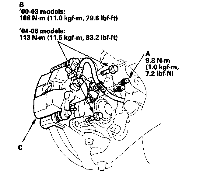 4. Remove the caliper bracket mounting bolts (B), and remove the caliper assembly (C) from the knuckle. To prevent damage to the caliper assembly or brake hose, use a short piece of wire to hang the caliper assembly from the undercarriage. Do not twist the brake hose excessively.