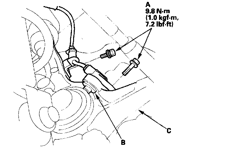5. Remove the flange bolts (A) and wheel sensor (B) from the knuckle (C). Do not disconnect the wheel sensor connector.