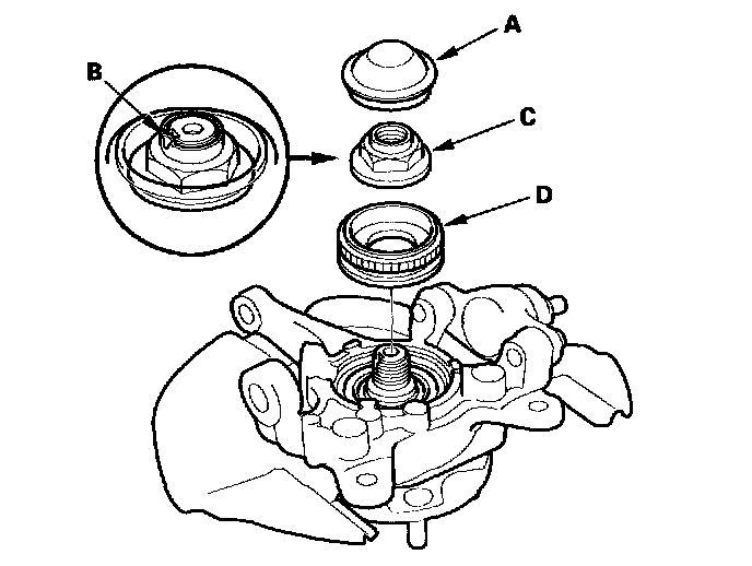 30. Apply a small amount of engine oil to the seating surface of a new spindle nut (B). Install the new nut, and tighten it to the specified torque value. Stake (C) the nut shoulder against the driveshaft with a drift.