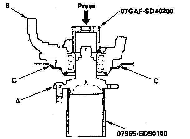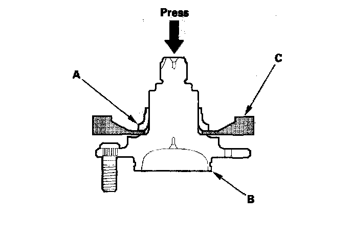 28. Install the hub (A) onto the knuckle (B) using the special tools and a hydraulic press. Be careful not to distort the splash guard (C).