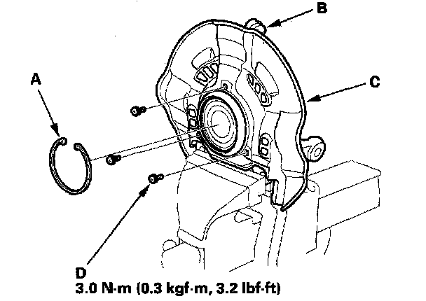 20. Remove the screws (A), snap ring (B), and the splash guard (C) from the knuckle (D).