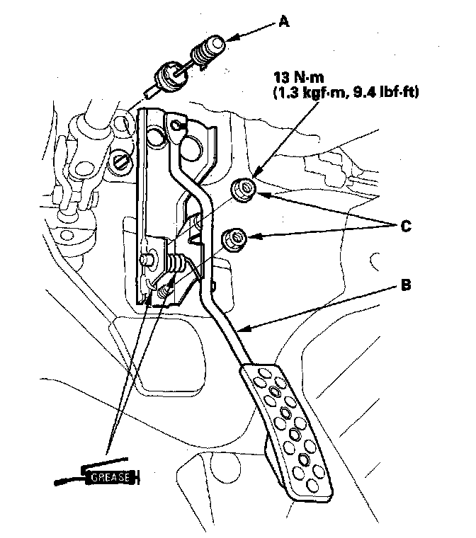 Remove the nuts (C) and the accelerator pedal.