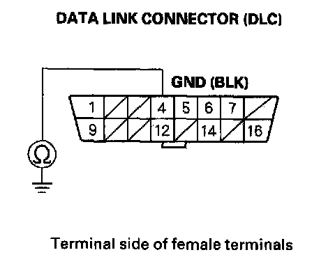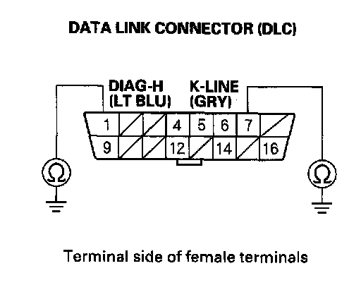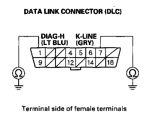 15. Check for continuity between DLC terminals No. 1 and No. 7 and body ground individually.
