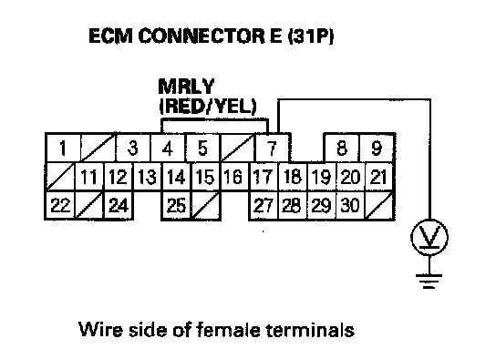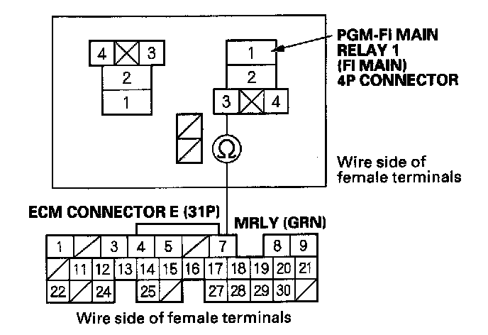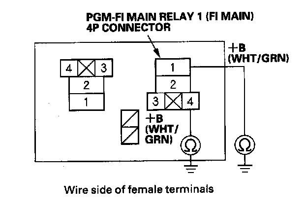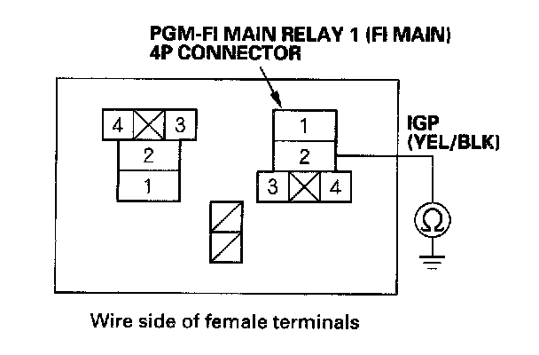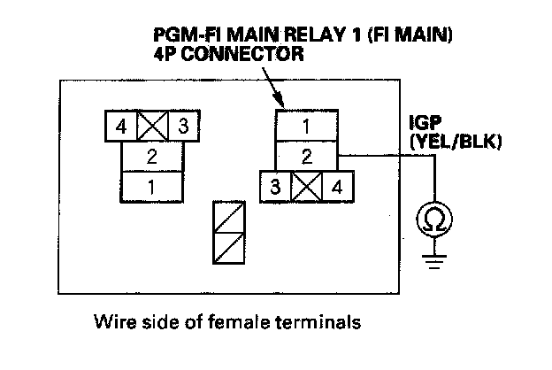 38. Check for continuity between body ground and PGM-FI main relay 1 (FI MAIN) 4P connector terminals No. 1 and No. 4 individually.
