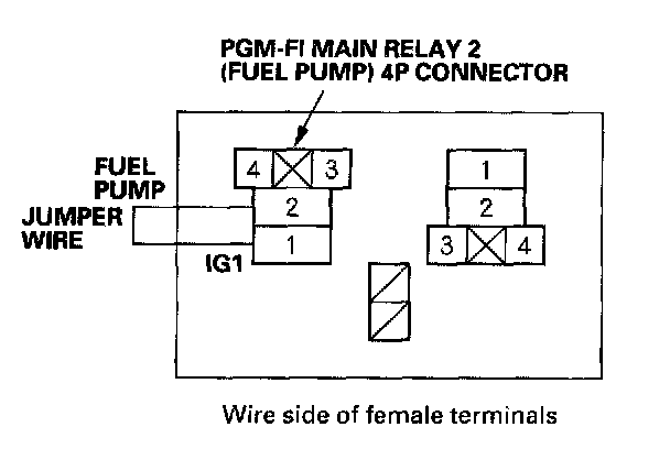 27. Connect PGM-FI main relay 2 (FUEL PUMP) 4P connector terminals No. 1 and No. 2 with a jumper wire.