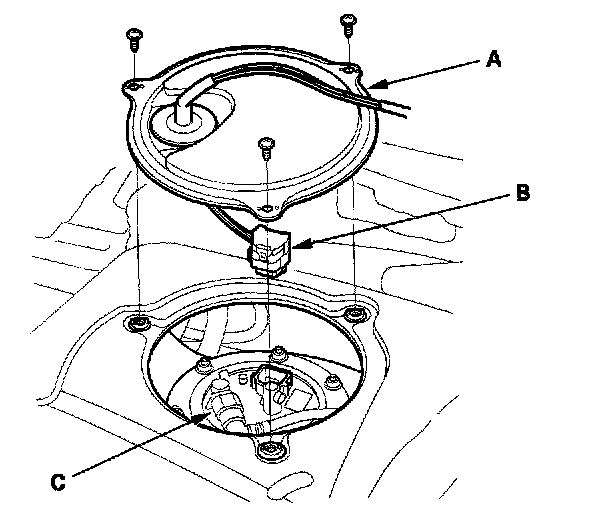 9. Remove the fuel filter set (A), the fuel gauge sending unit (B), and the wire harness (C).