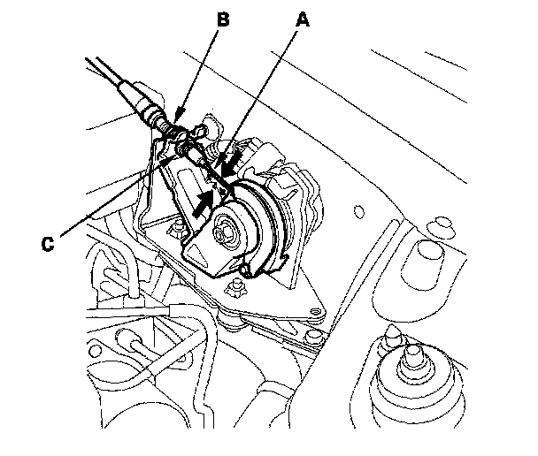 3. If the free play is not within spec (9/16 - 11/16 in., 15 - 18 mm), loosen the locknut (B), turn the adjusting nut (C) until the deflection is as specified, then retighten the locknut.