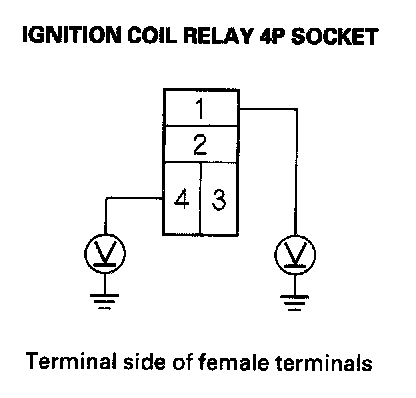 3. Measure the voltage between ignition coil relay 4P socket terminal No. 1 and body ground, then terminal No. 4 and body ground.