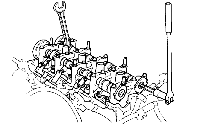 2. Hold the camshaft with an open-end wrench, then loosen the bolt.