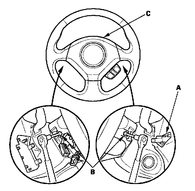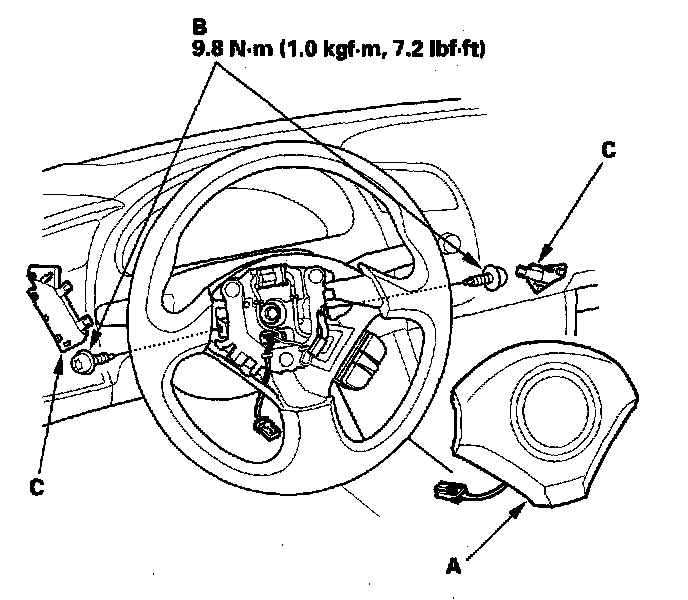 1. Place the new driver's airbag (A) in the steering wheel, and secure it with new Torx bolts (B). Install the covers (C).