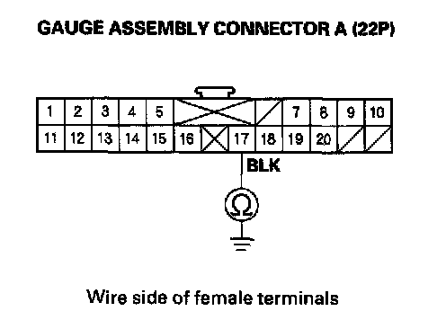 3. Check resistance between the No. 17 terminal of gauge assembly connector A (22P) and body ground. There should be 0 - 1.0 Ohm.