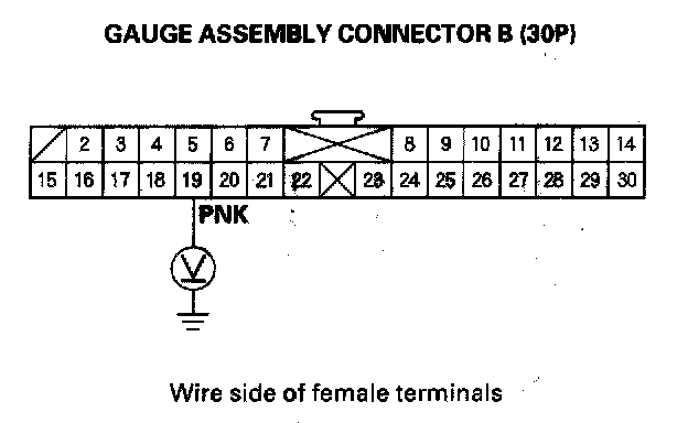 7. Reconnect the battery negative cable. Connect a voltmeter between the No. 19 terminal of gauge assembly connector B (30P) and body ground. Turn the ignition switch ON (II), and measure voltage. There should be 0.5 V or less.