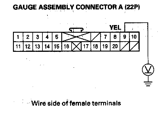 9. Connect a voltmeter between the No, 9 terminal of gauge assembly connector A (22P) and body ground. Turn the ignition switch ON (II), and measure the voltage. There should be battery voltage.