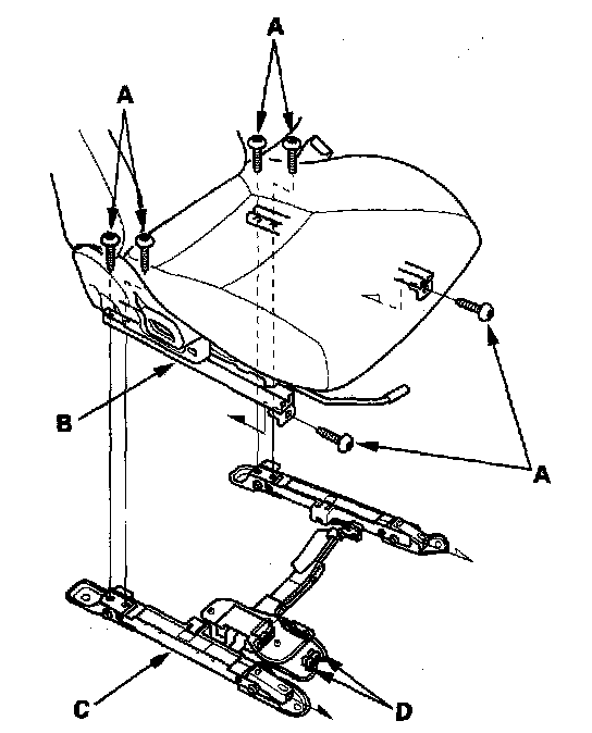 3. Remove the tamper-resistant Torx bolts (A) attaching the seat track (B) to the weight sensors (C).