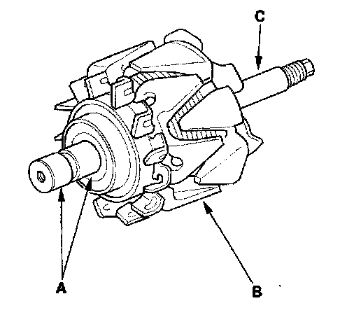 21. Then check for continuity between each slip ring and the rotor (B) and the rotor shaft (C).