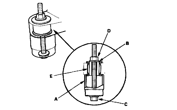 3. Hold the nut with a wrench, and tighten the flange bolt with another wrench. Remove the gearbox mount cushion (E).