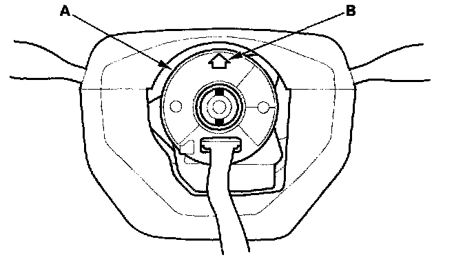 Steering Wheel Installation1. Before installing the steering wheel, make sure the front wheels are aligned straight ahead, then center the cable reel (A). Do this by first rotating the cable reel clockwise until it stops. Then rotate it counterclockwise about two and half turns. The arrow mark (B) on the cable reel label point should point straight up.