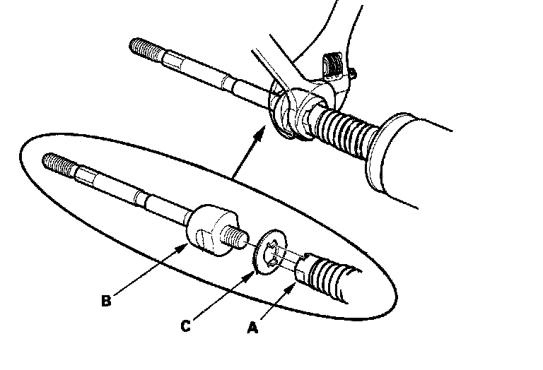 3. Hold the flat surface sections (A) on the passenger's side steering rack shaft with one wrench, and unscrew both rack ends (B) with another wrench. Be careful not to damage the shaft surface with the wrench. Remove the lock washers (C) and discard them.