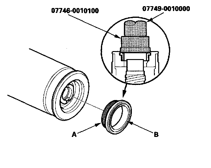 5. If the rubber stop was removed, position a new rubber stop (A) in the gearbox housing, then drive it in using the special tools as shown. Make sure that the special tool presses against the metal portion (B) of the rubber stop.