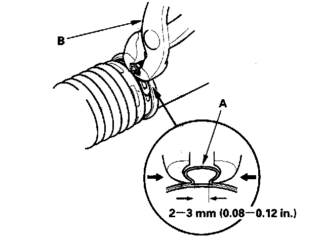 9. Close the ear portion (A) of the band with commercially available pincers, Oetiker 1098 or equivalent (B).