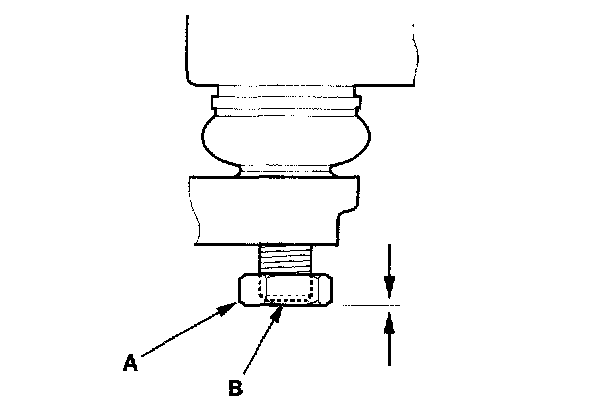 1. Install a hex nut (A) onto the threads of the ball joint (B). Make sure the nut is flush with the ball joint pin end to prevent damage to the thread end of the ball joint pin.