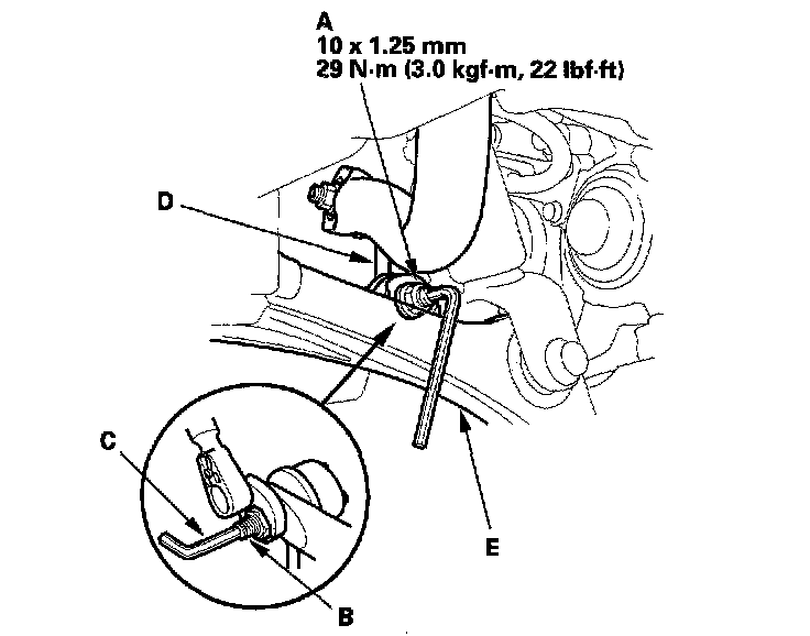 2. Remove the flange nut (A) while holding the joint pin (B) with a hex wrench (C), and disconnect the stabilizer link (D) from the lower arm (E).