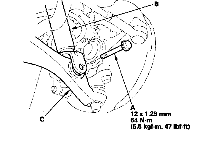 3. Remove the flange bolt (A), and disconnect the damper (B) from the lower arm (C).
