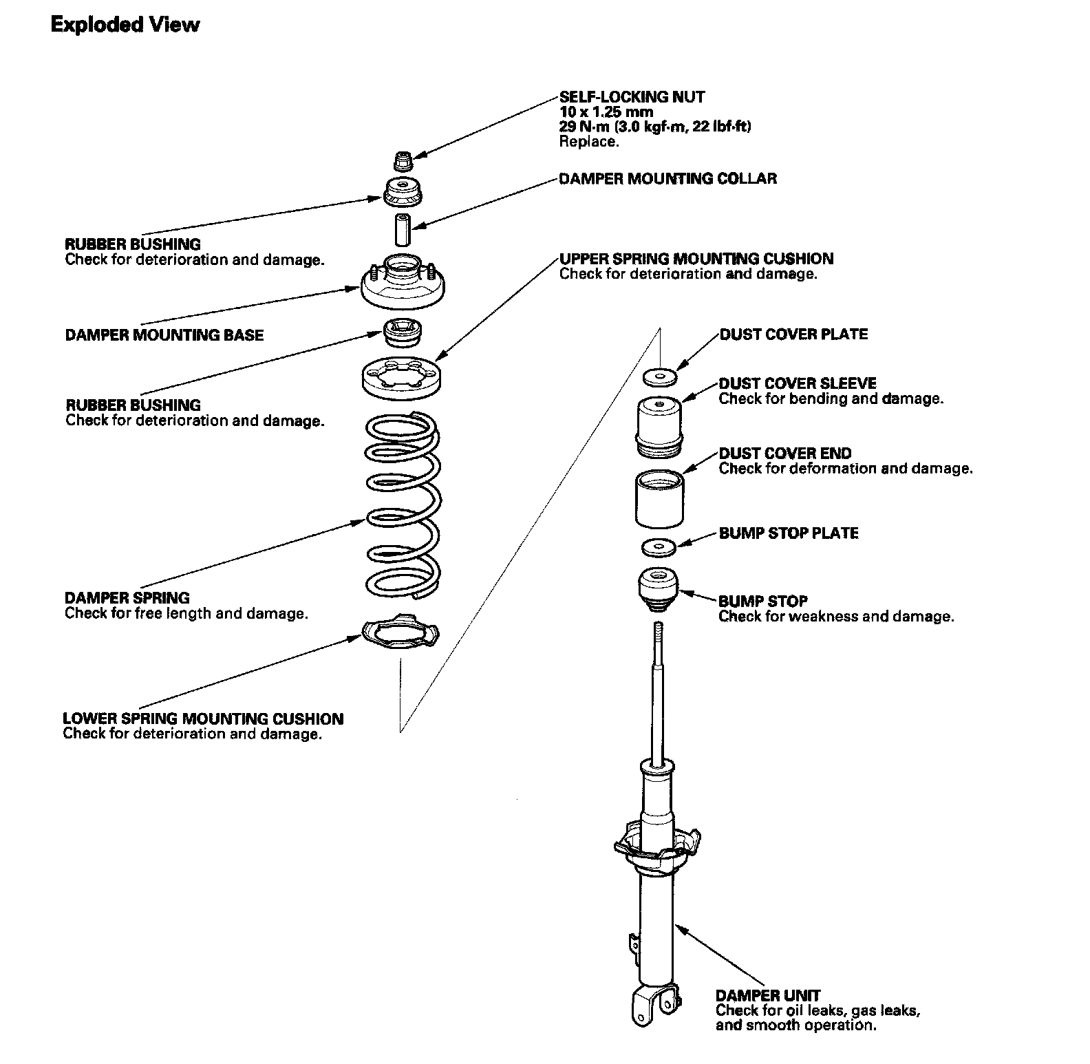 2. Release the pressure from the strut spring compressor, then disassemble the damper as shown in the Exploded View.