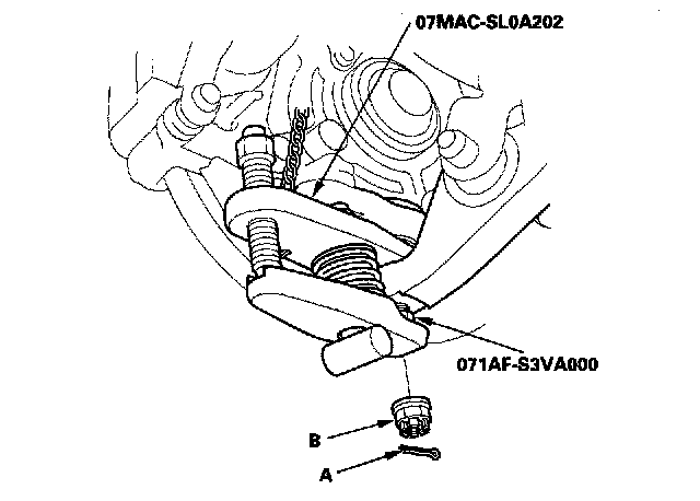 4. Remove the cotter pin (A) from the lower arm ball joint, and remove the castle nut (B).