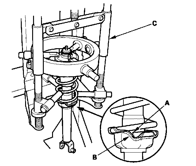 2. Install the damper assembly on a commercially available strut spring compressor (C).