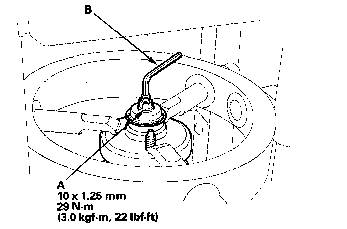 6. Hold the damper shaft with a hex wrench (B), and tighten the self-locking nut to the specified torque.