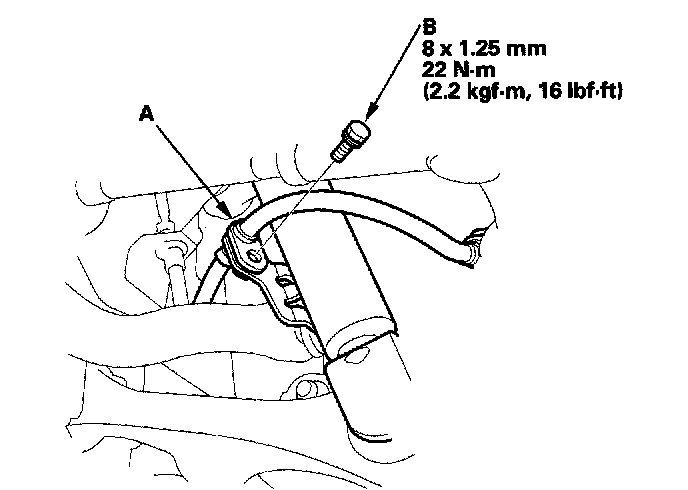 10. Install the brake hose mounting bracket (A) and the flange bolt (B) to the damper, and tighten the bolt to the specified torque value.