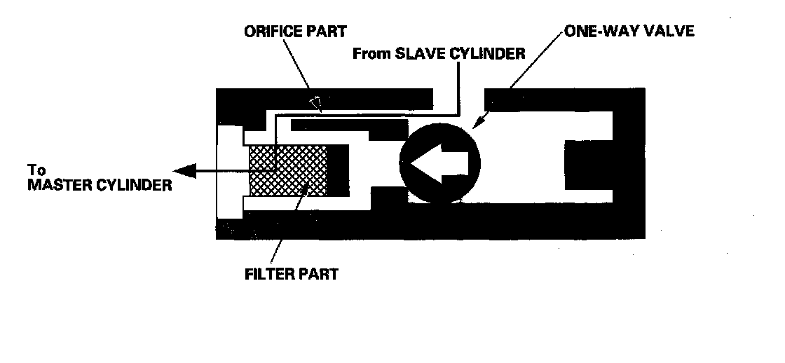 When the clutch pedal is released, the fluid pressure from the slave cylinder moves the one-way valve in the direction shown in the illustration. The one-way valve blocks the filter part passage and delays the clutch release speed by returning the fluid to the master cylinder through only the orifice part passage.